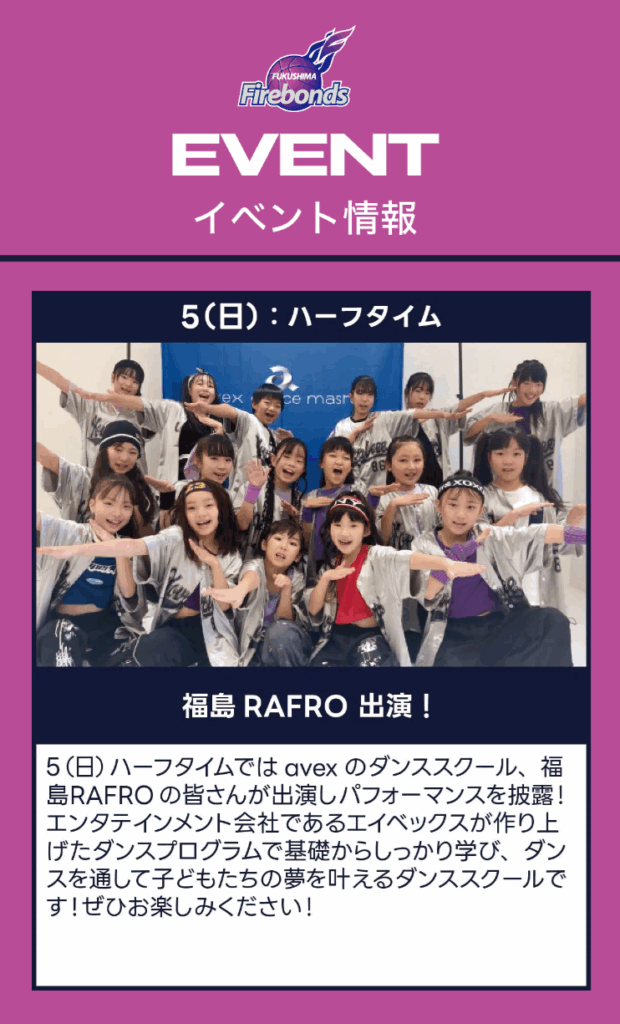 RAFROの子供たちが、福島ファイヤーボンズ開幕戦2日目のハーフタイムにて、ダンスパフォーマンスを披露します!!かわいくてカッコイイパフォーマンスをご覧ください。